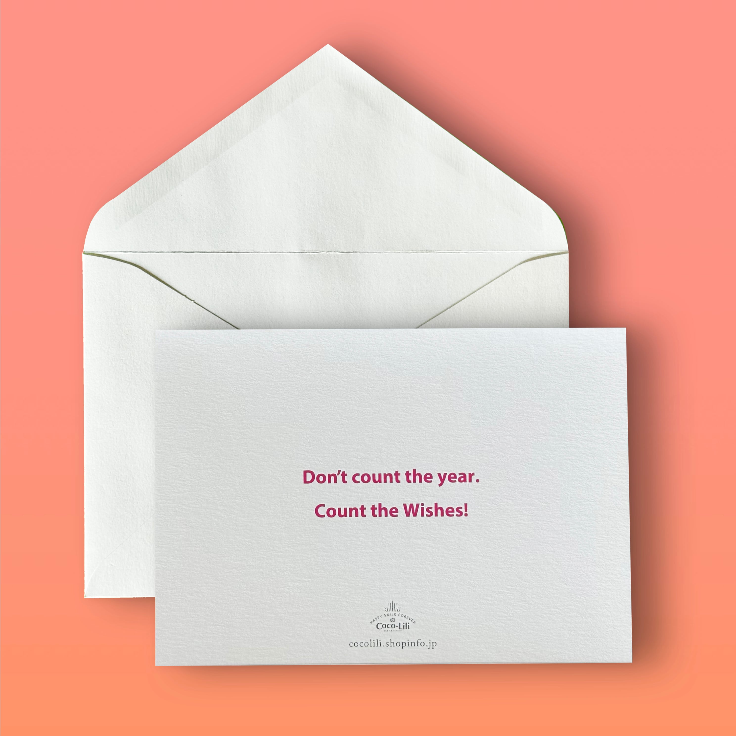裏面の英文は「年を数えるのではなく、願い事を数えよう」です。