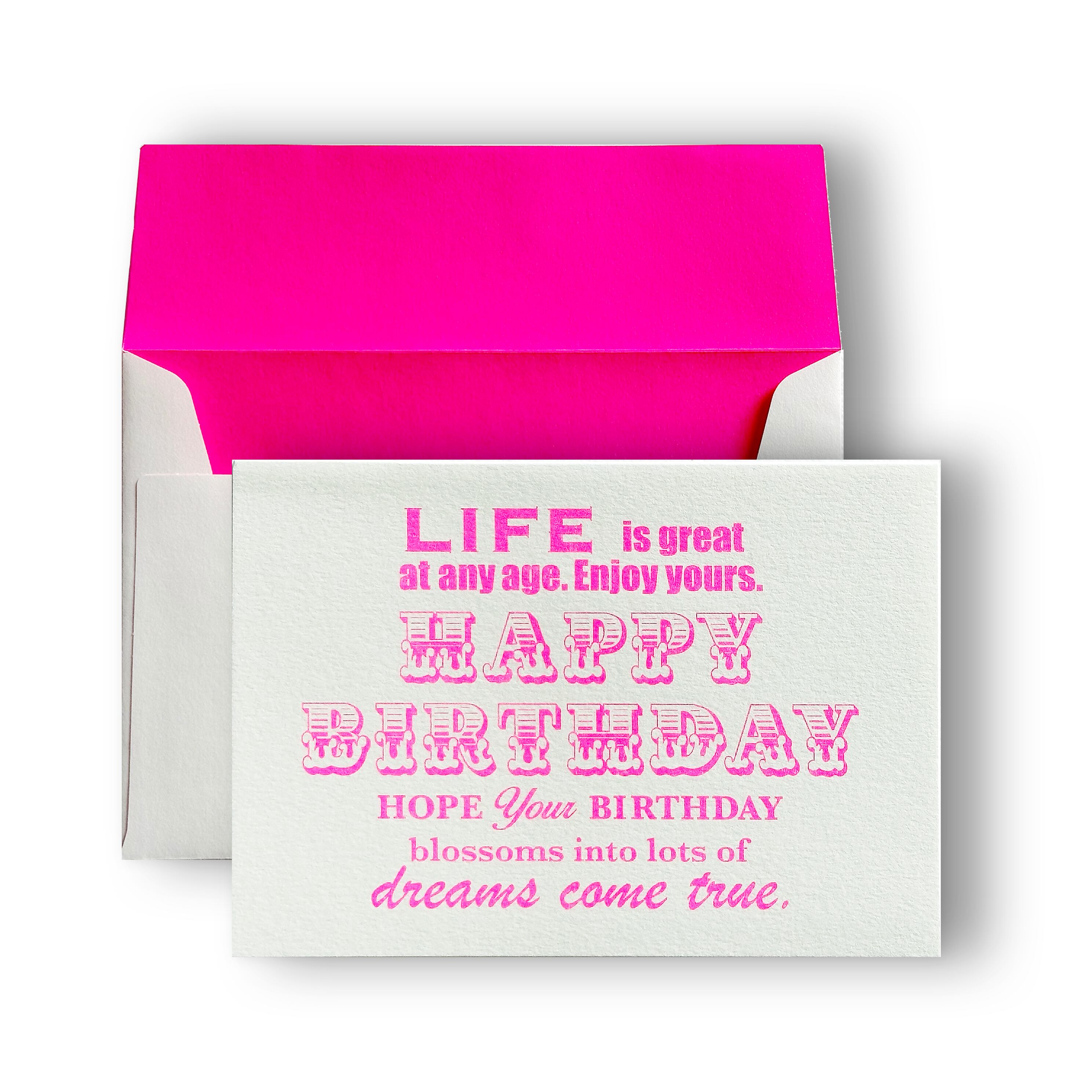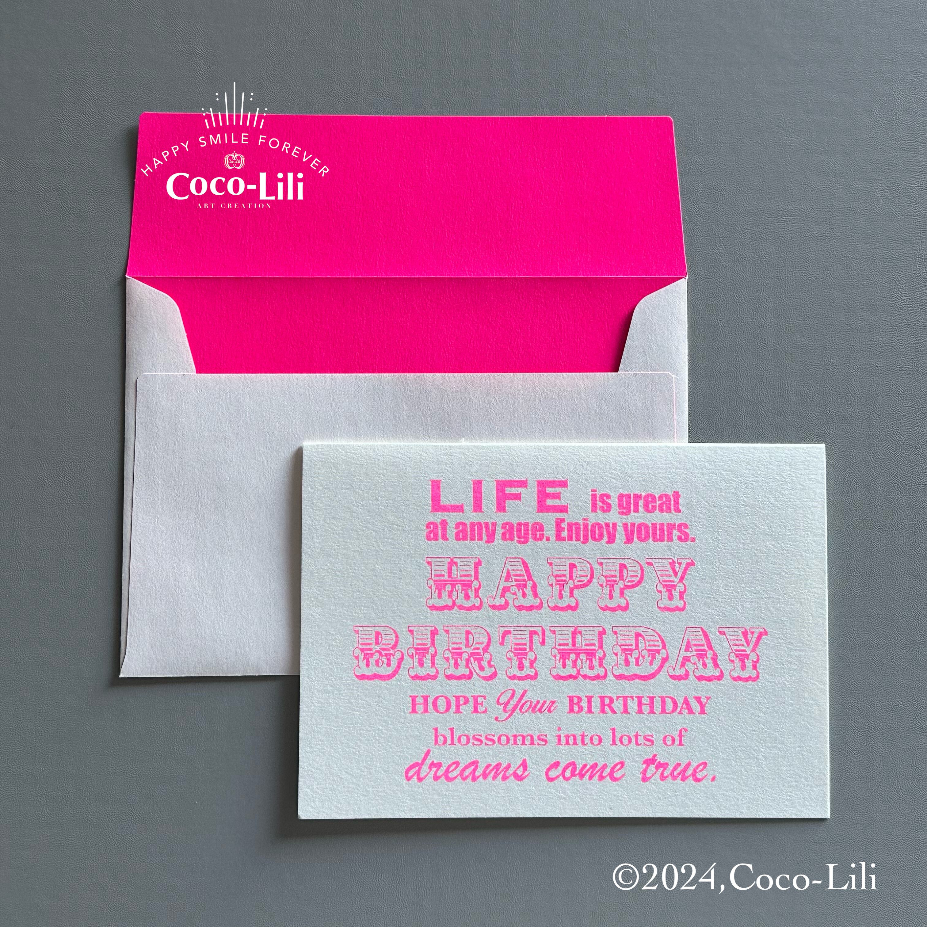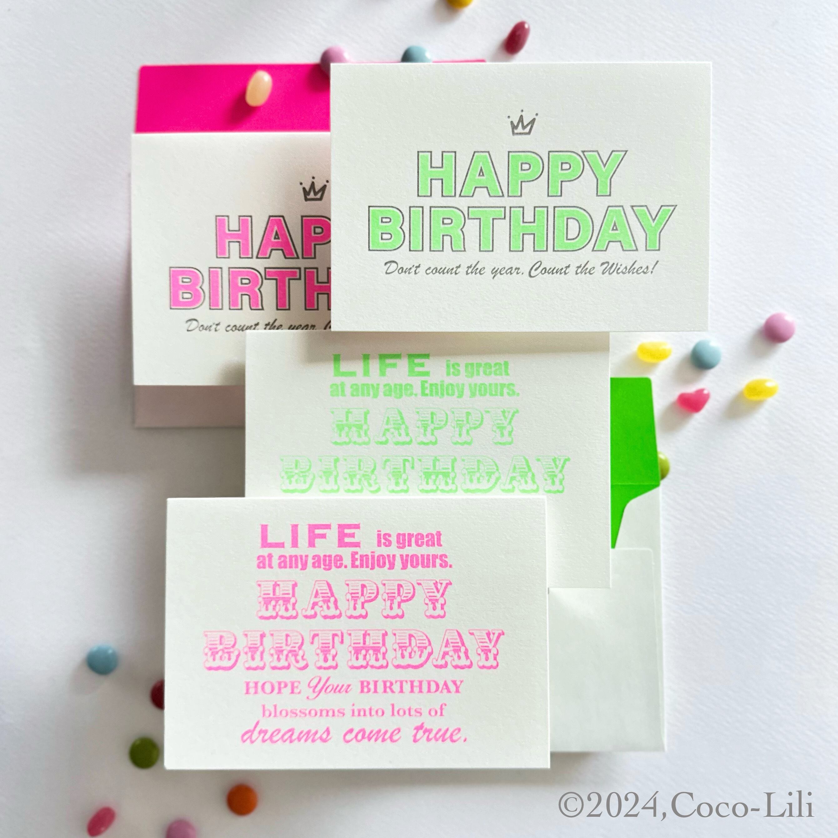 毎日が誰かの誕生日!おめでとうを贈ろう。 蛍光カラーが眩しいバースデーカード。 誕生日を祝う喜びが伝わるカードです。 サイズ:105×148mm/封筒洋型2号